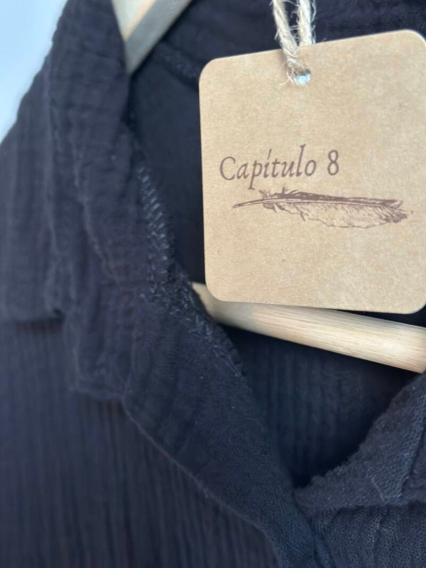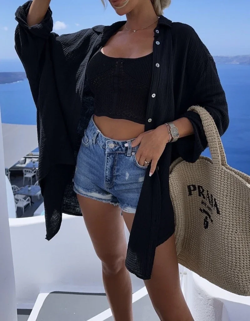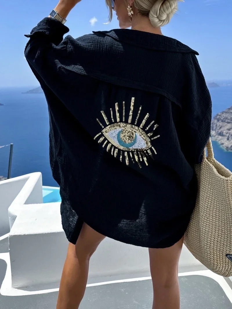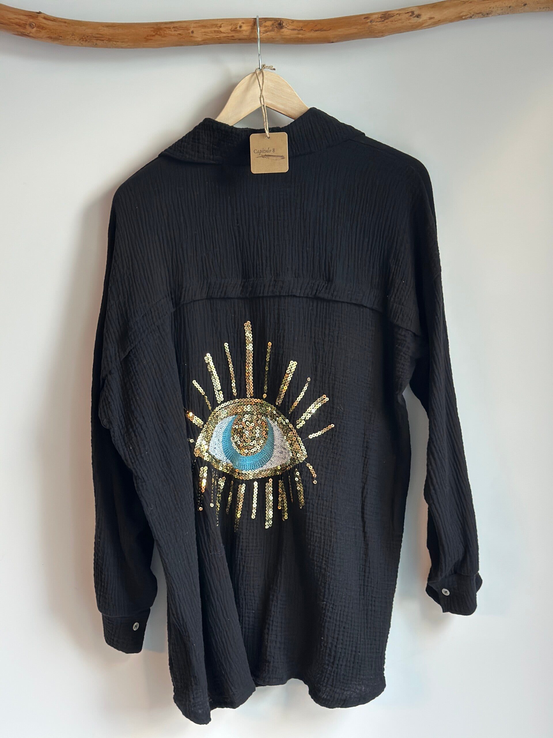 Light airy cotton shirt with a sequin eye motif on the back. One size.