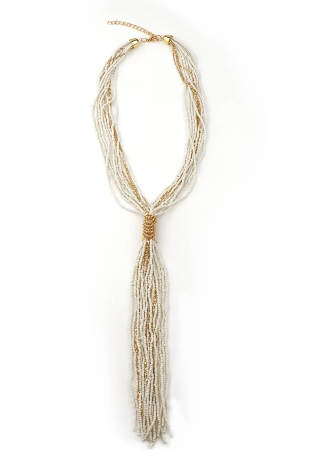 Collar artesanal hecho con pequeñas cuentas de vidrio. En el centro, los hilos se unen en un elegante nudo que termina en un fleco juguetón. Largo: 49 cm