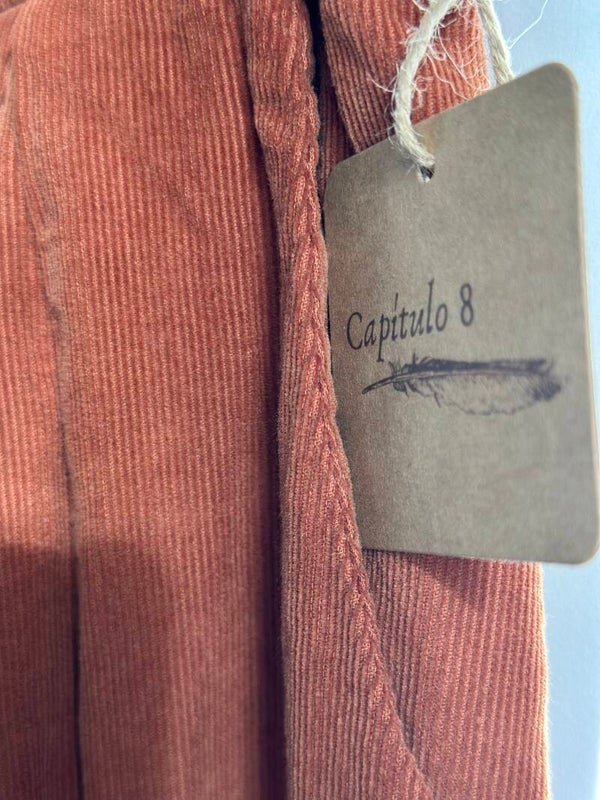 Lichte ribfluwelen rok van 100% katoen, met twee handige zakken vooraan en subtiele riemlussen.