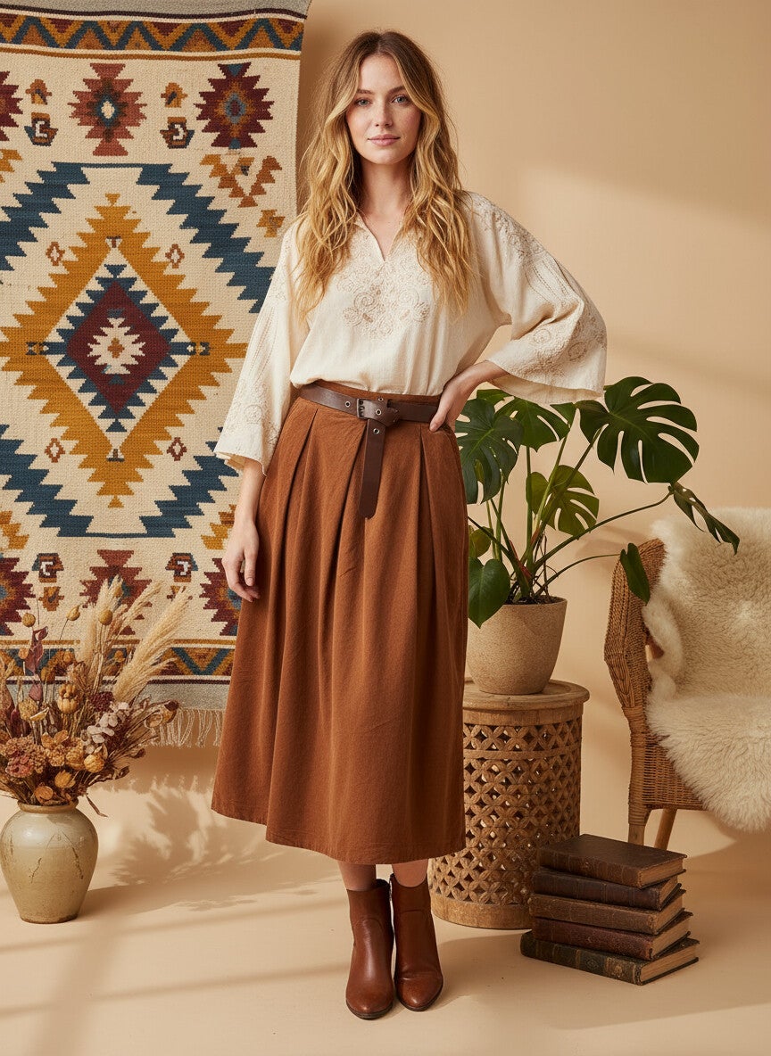 Falda de pana ligera, confeccionada en 100% algodón, con dos prácticos bolsillos delanteros y sutiles presillas para cinturón.