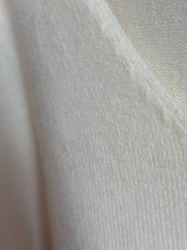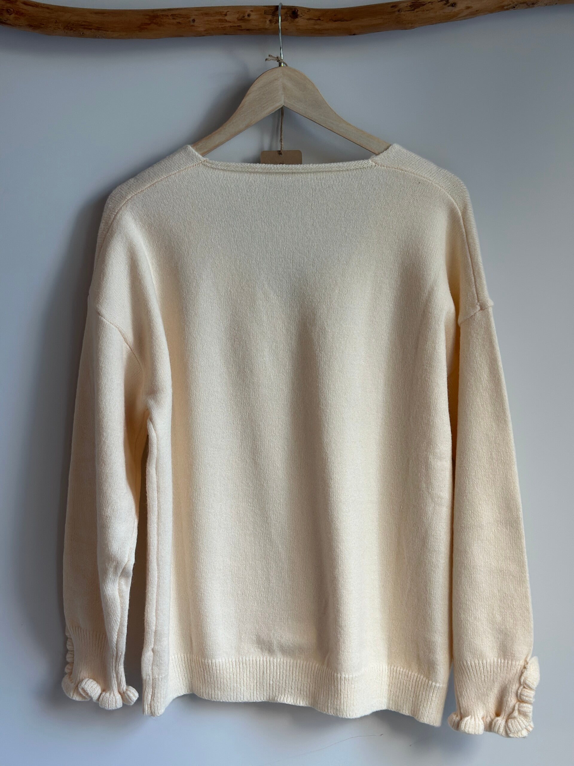 Soft cream-colored sweater with a V-neck, long sleeves, and elegant ruffles. Its relaxed cut ensures a comfortable and flattering fit from size 38 (EU) and up. Long fit – ideal for a height from about 1m68 / 5'6" and up.