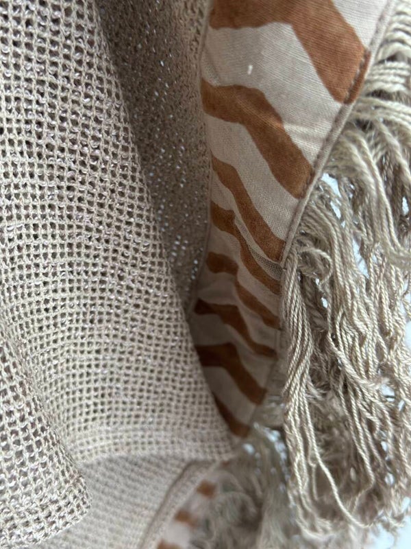 This short summer kimono is made of 100% woven cotton and features a loose fit. Thanks to the wide 3/4 sleeves with playful fringes, it drapes softly and lightly — perfect for warm days. The kimono comes in one size (EU 36–46) and is machine washable at 30°C.