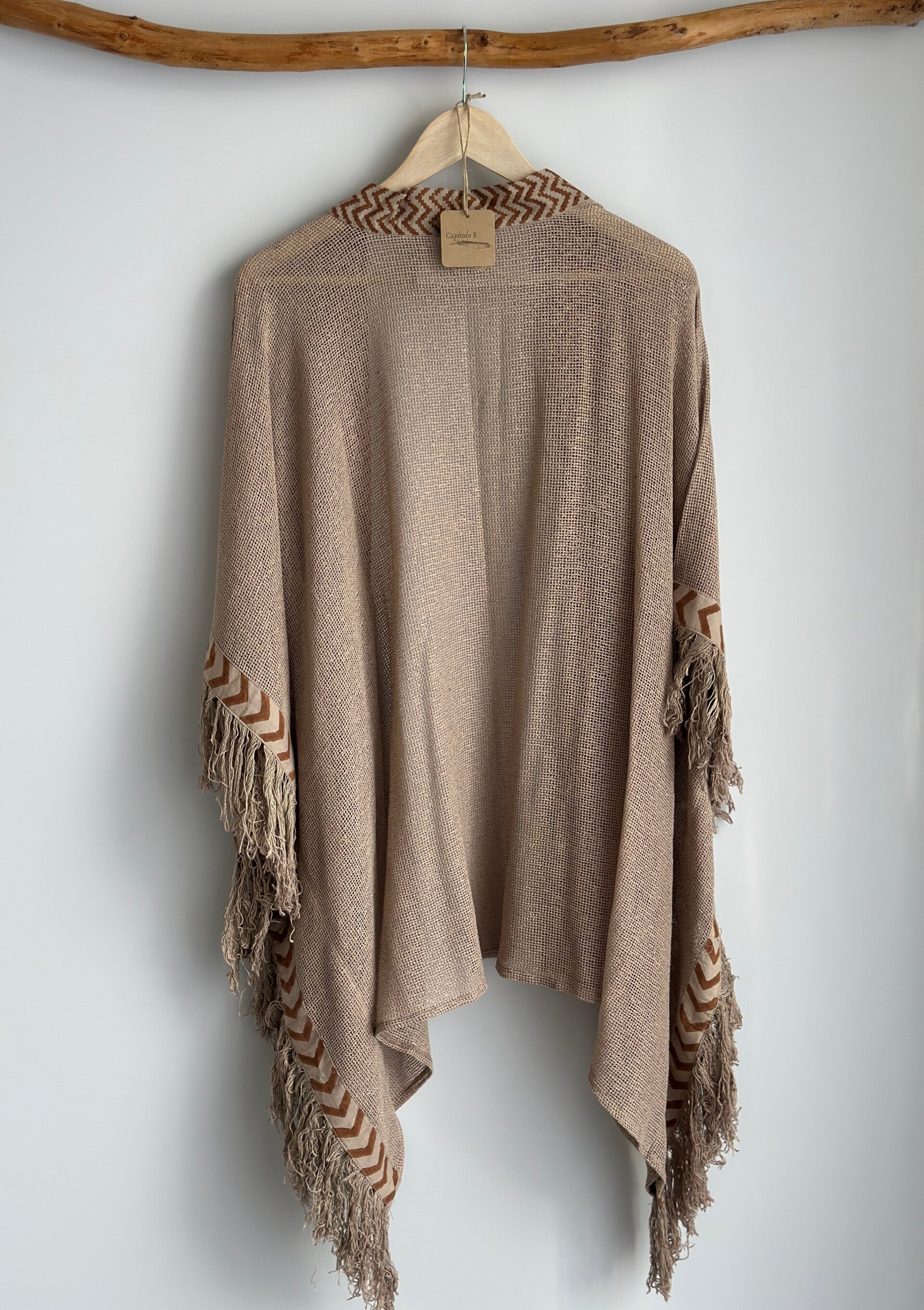 Este kimono corto de verano está hecho de 100% algodón tejido y tiene un corte holgado. Gracias a las mangas amplias de 3/4 con divertidos flecos, cae de forma suave y ligera, ideal para los días cálidos. El kimono está disponible en una sola talla (36–46) y se puede lavar a máquina a 30°C.