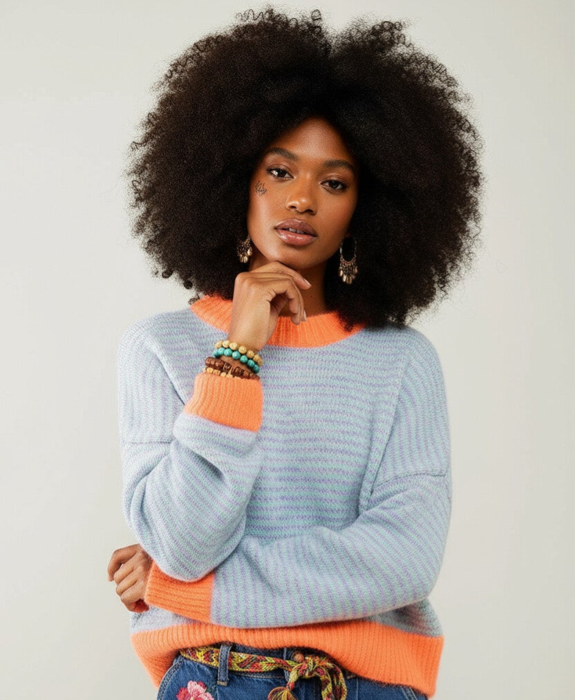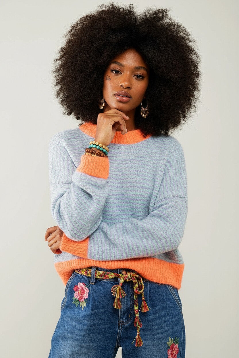 Knitted sweater featuring a striking mix of orange, soft blue, and purple. This warm and comfortable one-size sweater has a modern, slightly shorter cut than the classic style and fits true to size.