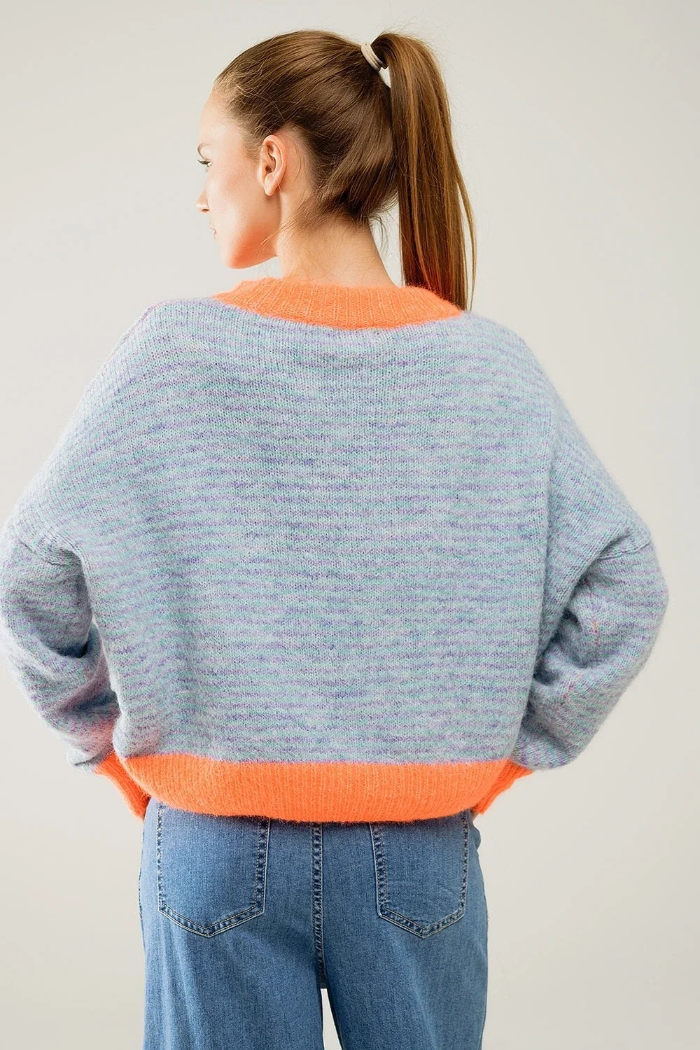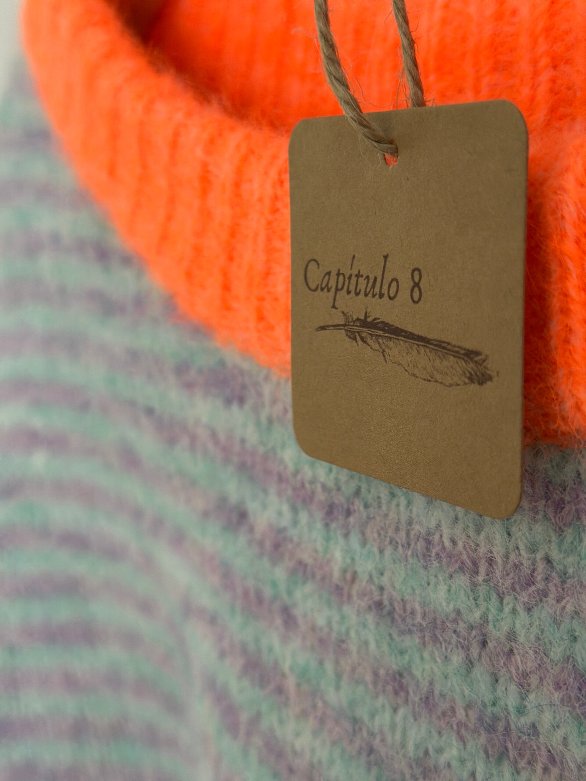 Jersey de punto con una llamativa combinación de naranja, azul suave y morado. Este jersey cálido y cómodo de talla única tiene un corte moderno, ligeramente más corto que el clásico, y se ajusta perfectamente a la talla.