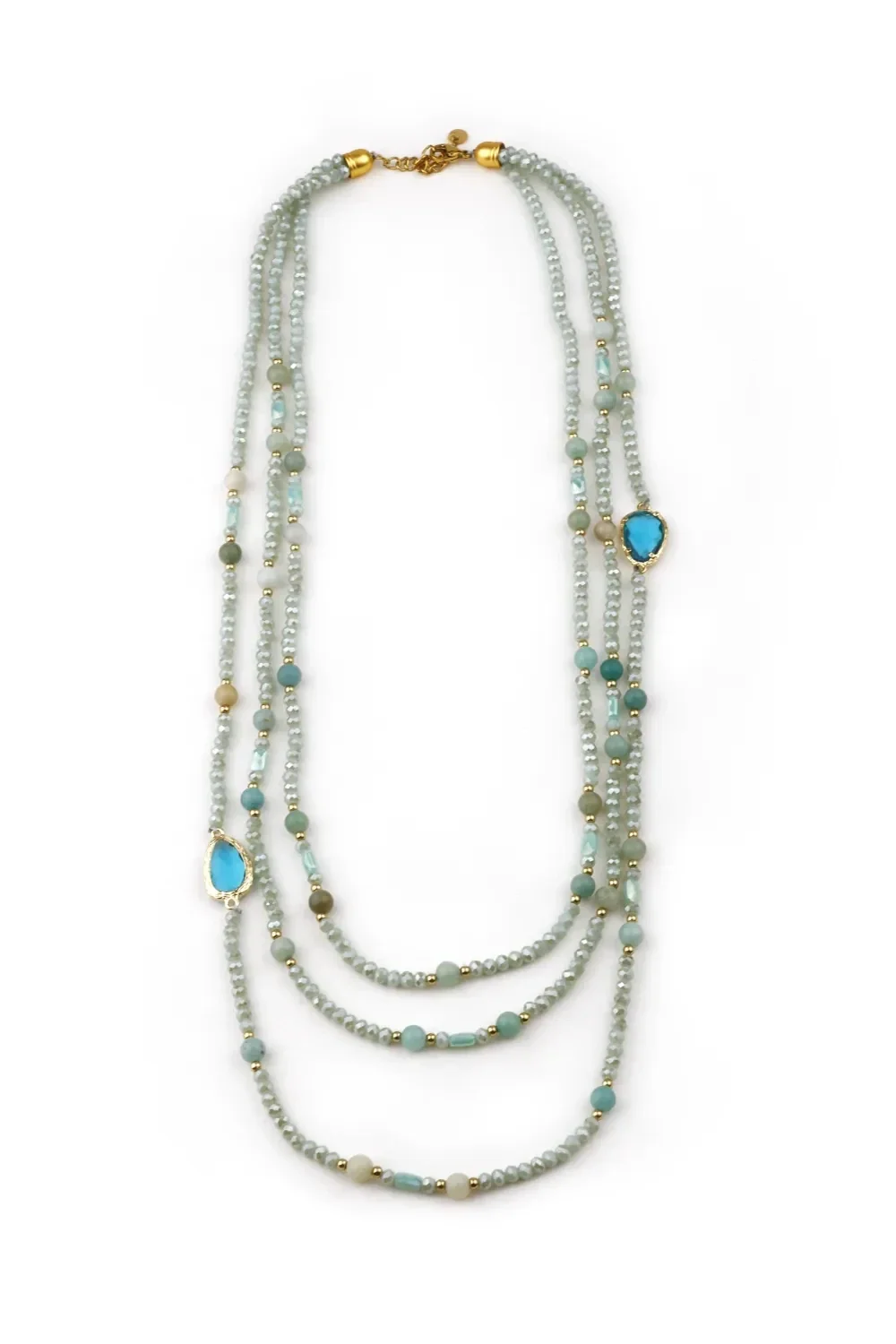 Collar largo de latón, piedra y vidrio con múltiples hilos de cuentas, adornado con colgantes en forma de lágrima.