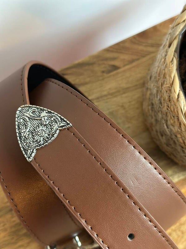 Cinturón de cuero sintético de alta calidad con un acabado refinado. Color: camel. El cinturón tiene una longitud total de 109 cm y cuenta con 10 agujeros, separados aproximadamente 2,5 cm entre sí. La distancia desde la hebilla hasta entre el quinto y sexto agujero es de unos 83,5 cm, lo que corresponde a una talla de cintura o pantalón de aproximadamente 82–85 cm.