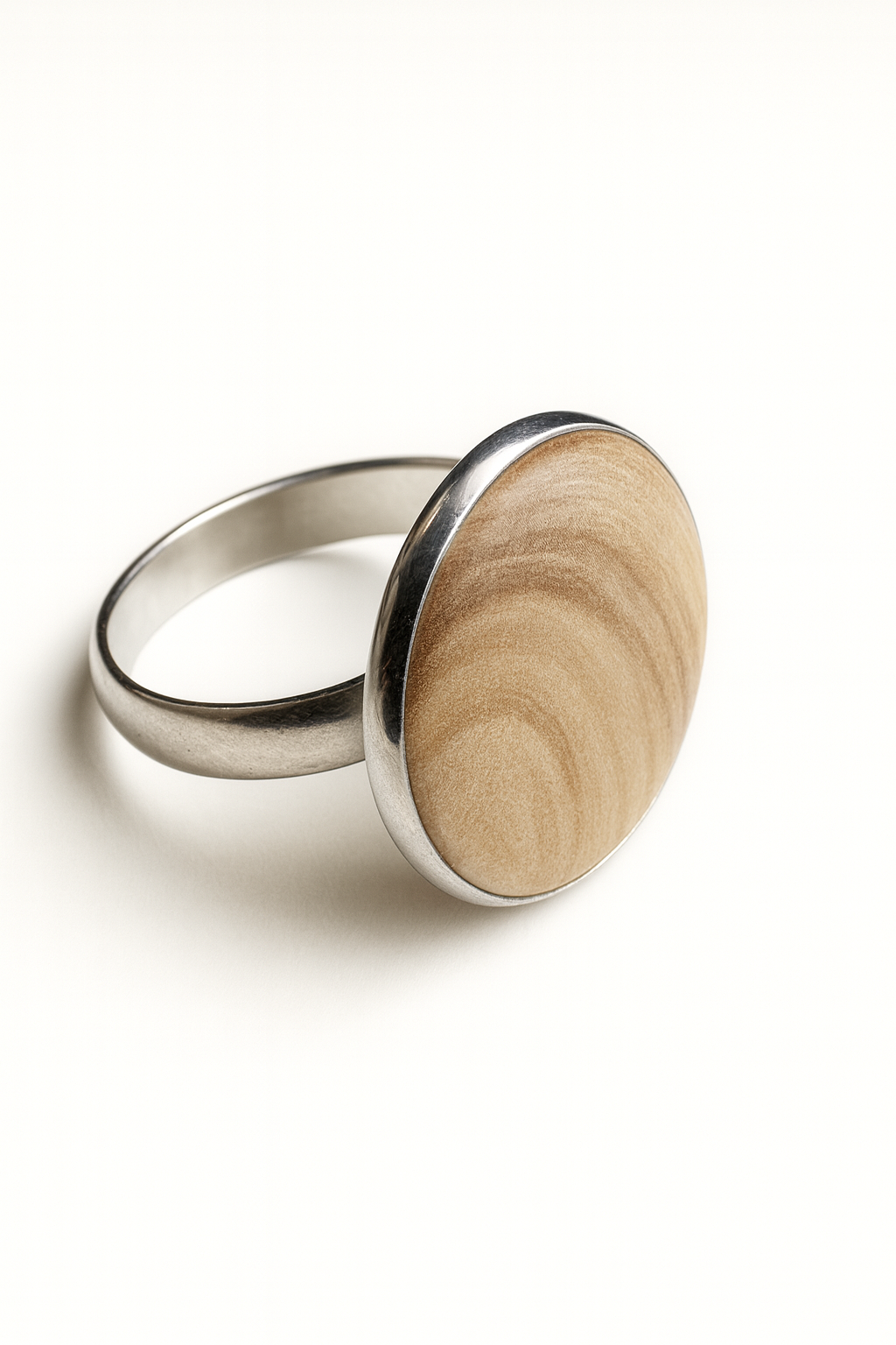 Este anillo está hecho a mano con madera natural de olivo. Cada pieza está diseñada artesanalmente y es única por el dibujo natural de la madera.