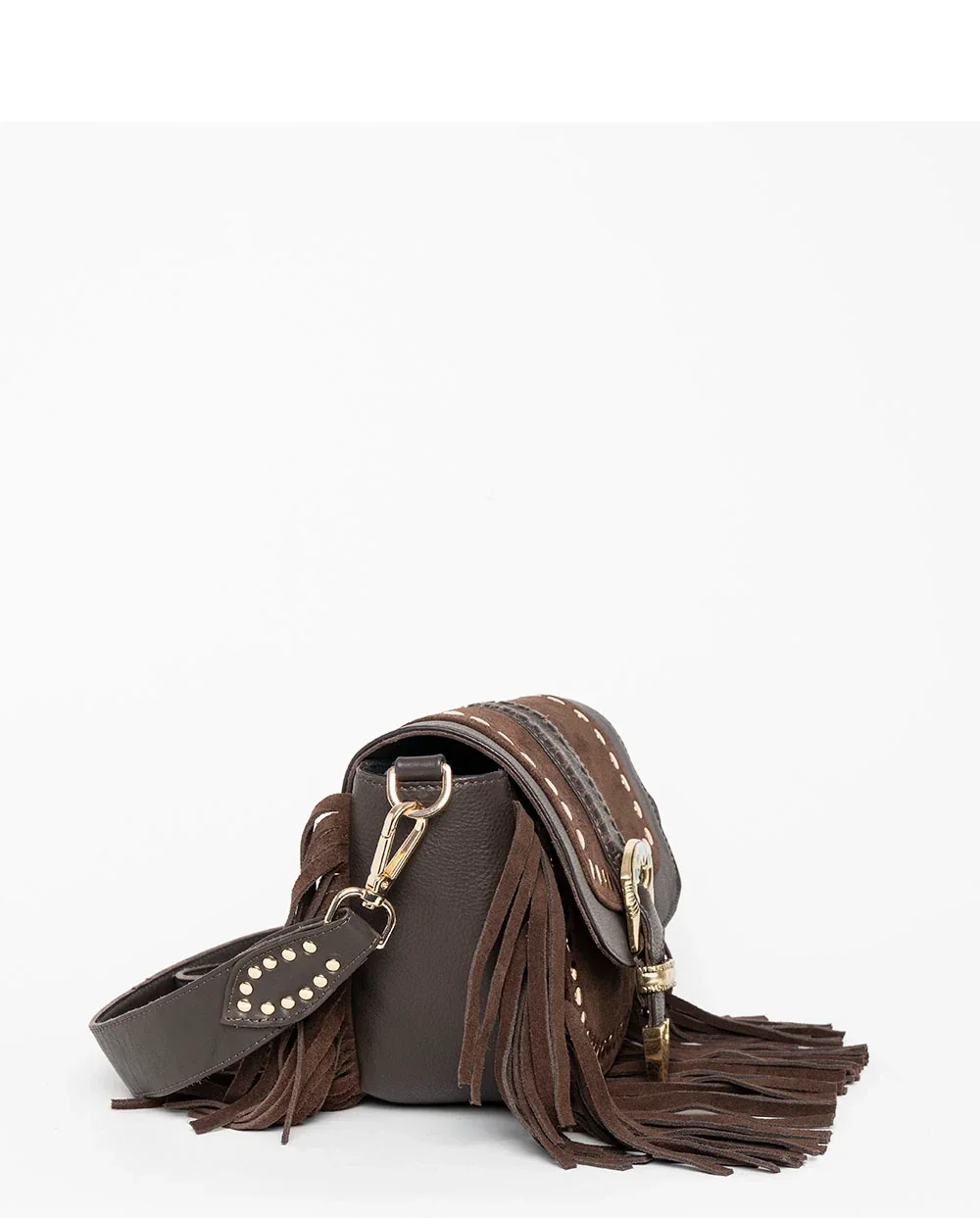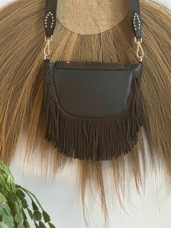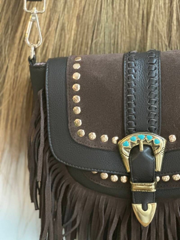 Bolso bandolera con correa larga, fabricado en 100% piel de alta calidad en un tono marrón oscuro y cálido. El bolso está delicadamente acabado con tachuelas doradas, flecos juguetones y una llamativa hebilla decorativa con piedra turquesa. La solapa de ante aporta textura y carácter, mientras que la correa de cuero ajustable y desmontable con tachuelas garantiza comodidad y estilo. Cada detalle está hecho a mano, lo que convierte este bolso en una pieza única de artesanía.