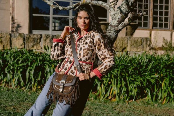 Crossbody tas met een lange schouderriem, vervaardigd van 100% hoogwaardig leer in warme, donkerbruine tint. De tas is verfijnd afgewerkt met goudkleurige studs, speelse franjes en een opvallende decoratieve gesp met turquoise steen. De suède klep geeft extra textuur en karakter, terwijl de afneembare en verstelbare leren schouderriem met studs zorgt voor optimaal draagcomfort en een stijlvolle uitstraling. Elk detail is met de hand afgewerkt, waardoor deze tas een uniek stuk vakmanschap vormt.