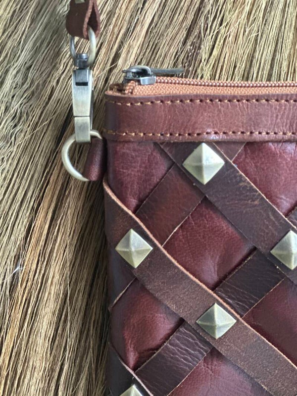 Clutch de cuero, hecha a mano en Marruecos. El diseño presenta un elegante patrón trenzado con tachuelas doradas, que le aporta un aspecto elegante y con carácter.
