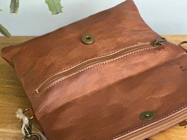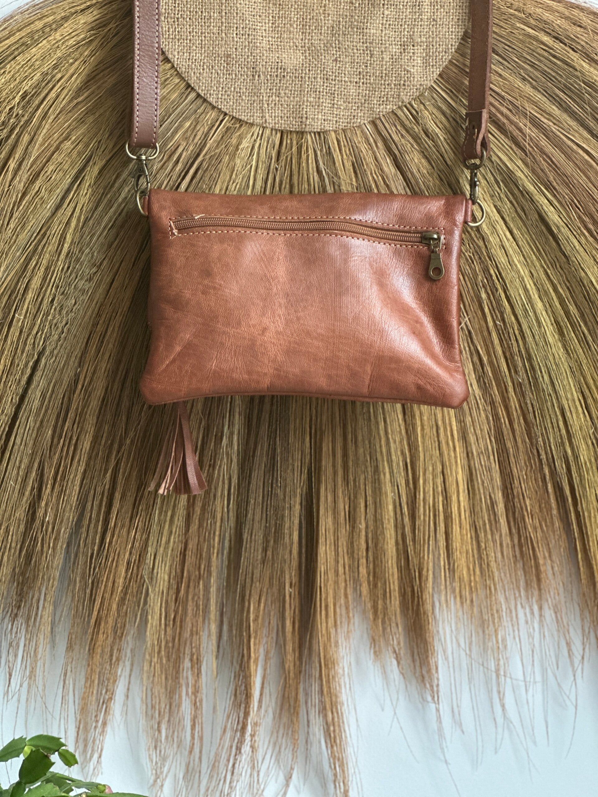 Clutch de cuero en un cálido tono coñac, decorada con un elegante patrón de tachuelas metálicas que aporta una sutil y moderna elegancia.