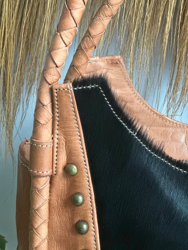 Bolso grande de hombro de cuero flexible con un panel frontal de piel de vaca negro intenso, acabado con laterales de cuero en tono coñac cálido. Los detalles trenzados en las asas y las tachuelas metálicas le dan al bolso un aspecto rústico y artesanal.
