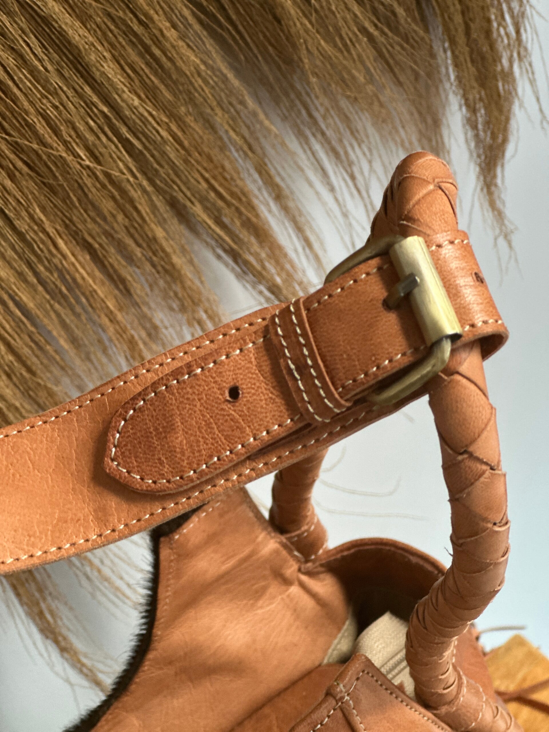 Large shoulder bag made of supple leather with a front panel in deep black cowhide, finished with warm cognac-colored leather sides. The braided details along the handles and metal studs give this bag a rugged, handcrafted look.
