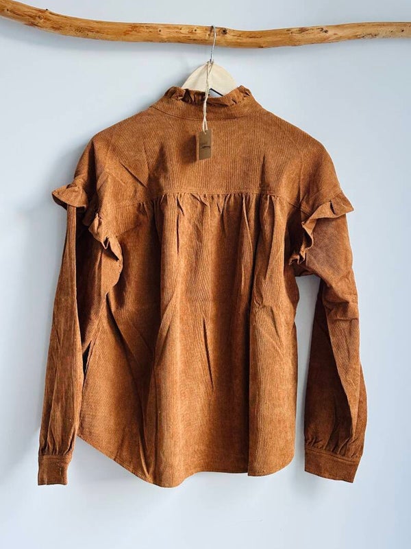 Blusa romántica con un aspecto delicado, confeccionada en suave pana ligera. Cuenta con frunces decorativos en los hombros y la tapeta de botones, cuello alto plisado y mangas largas con puños abotonados.