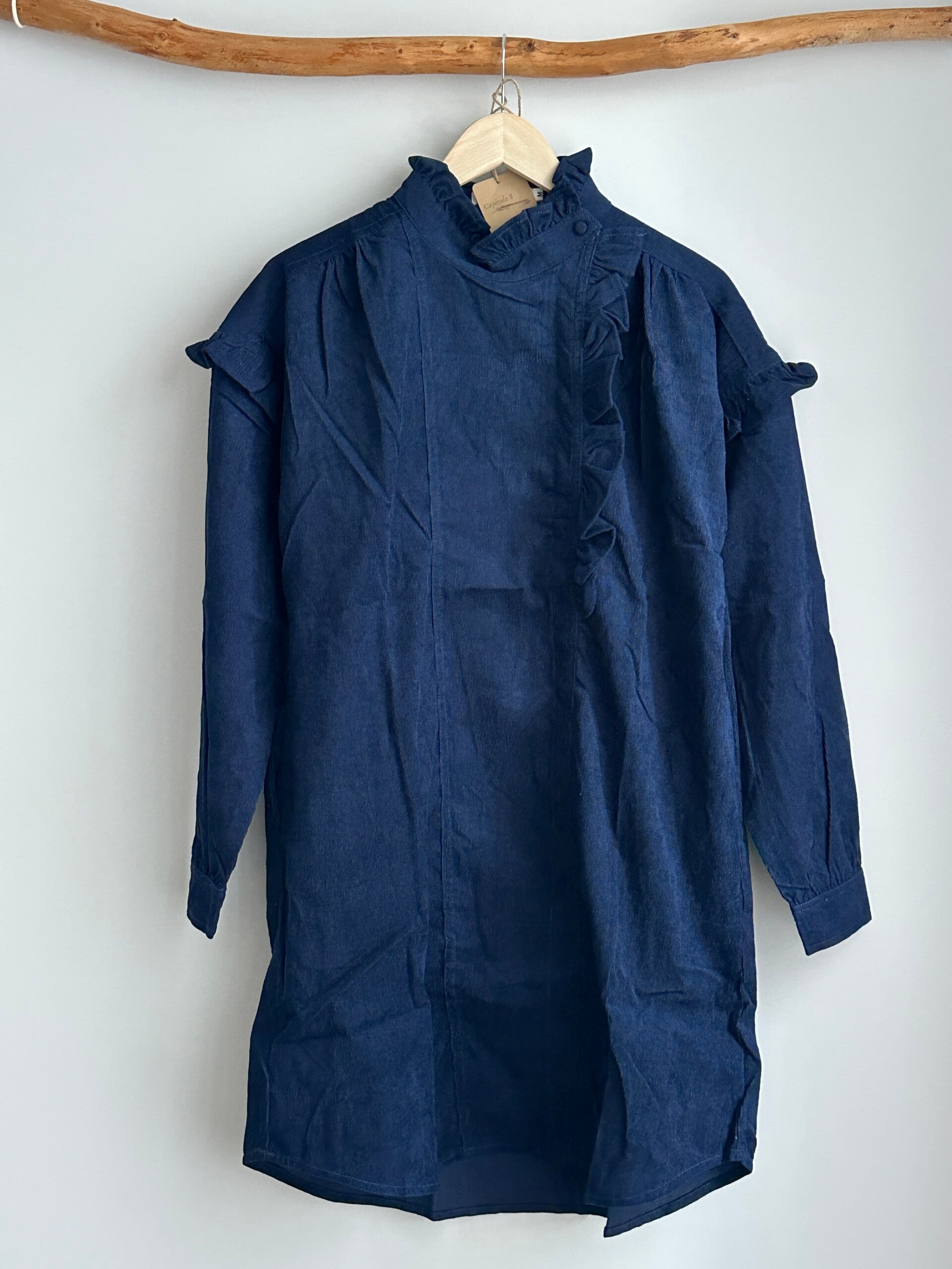 Oversized jurk van zachte corduroystof met decoratieve ruches aan de voorkant en schouders. Voorzien van een opstaande kraag en lange mouwen met manchetten. Gemaakt van 100% polyester.