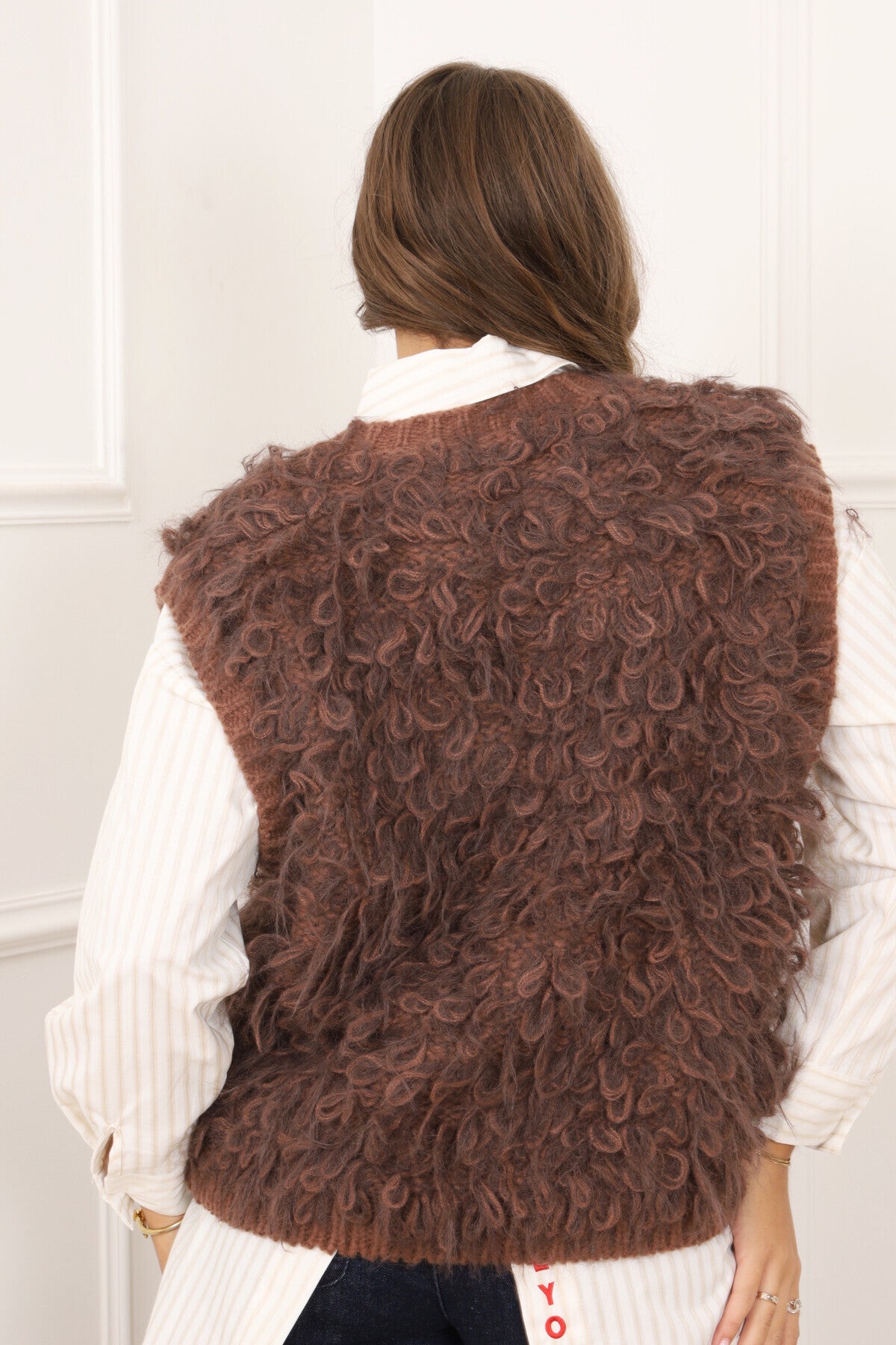 Mouwloos gilet van zachte boucléstof met een rijke, volumineuze textuur. Afgewerkt met een knoopsluiting aan de voorkant en vervaardigd uit een hoogwaardige mix van polyester, viscose en polyamide.