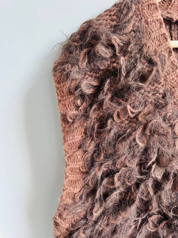 Sleeveless vest made from soft bouclé fabric with a rich, voluminous texture. Finished with a front button closure and crafted from a high-quality blend of polyester, viscose, and polyamide.