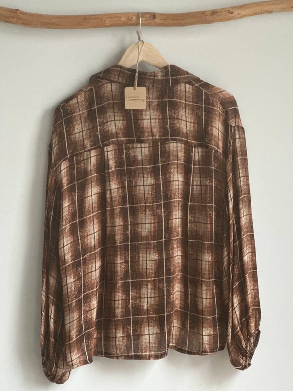 Warm chocolate brown blouse with V-neck, ruffles and puff sleeves in a checkered pattern. One size, fits sizes 36-44.