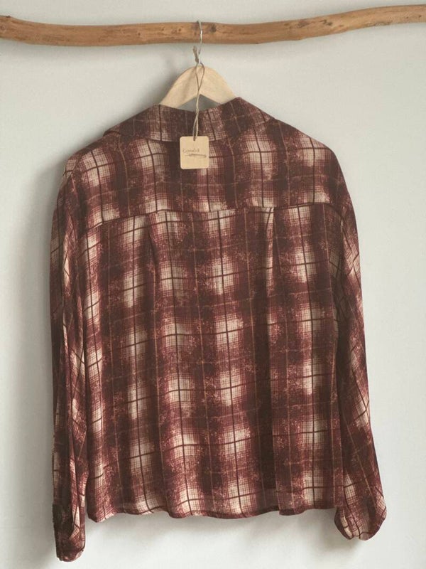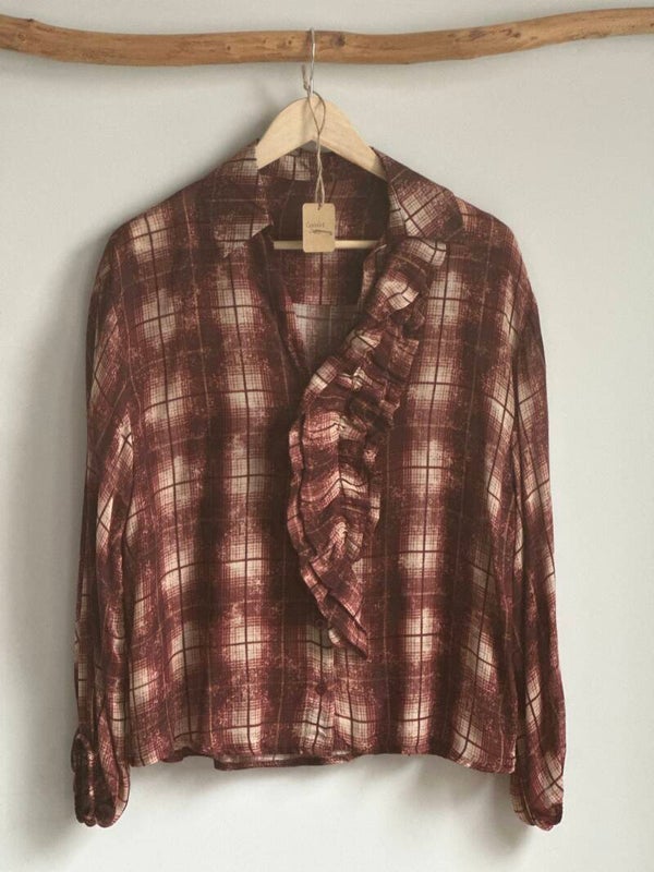 Burgundy blouse with V-neck, ruffles and puff sleeves in a checkered pattern. One size, fits sizes 36-44.