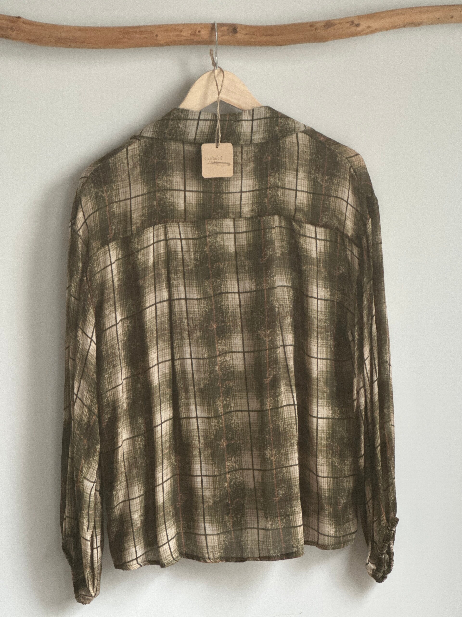 Green blouse with V-neck, ruffles and puff sleeves in a checkered pattern. One size, fits sizes 36-44.