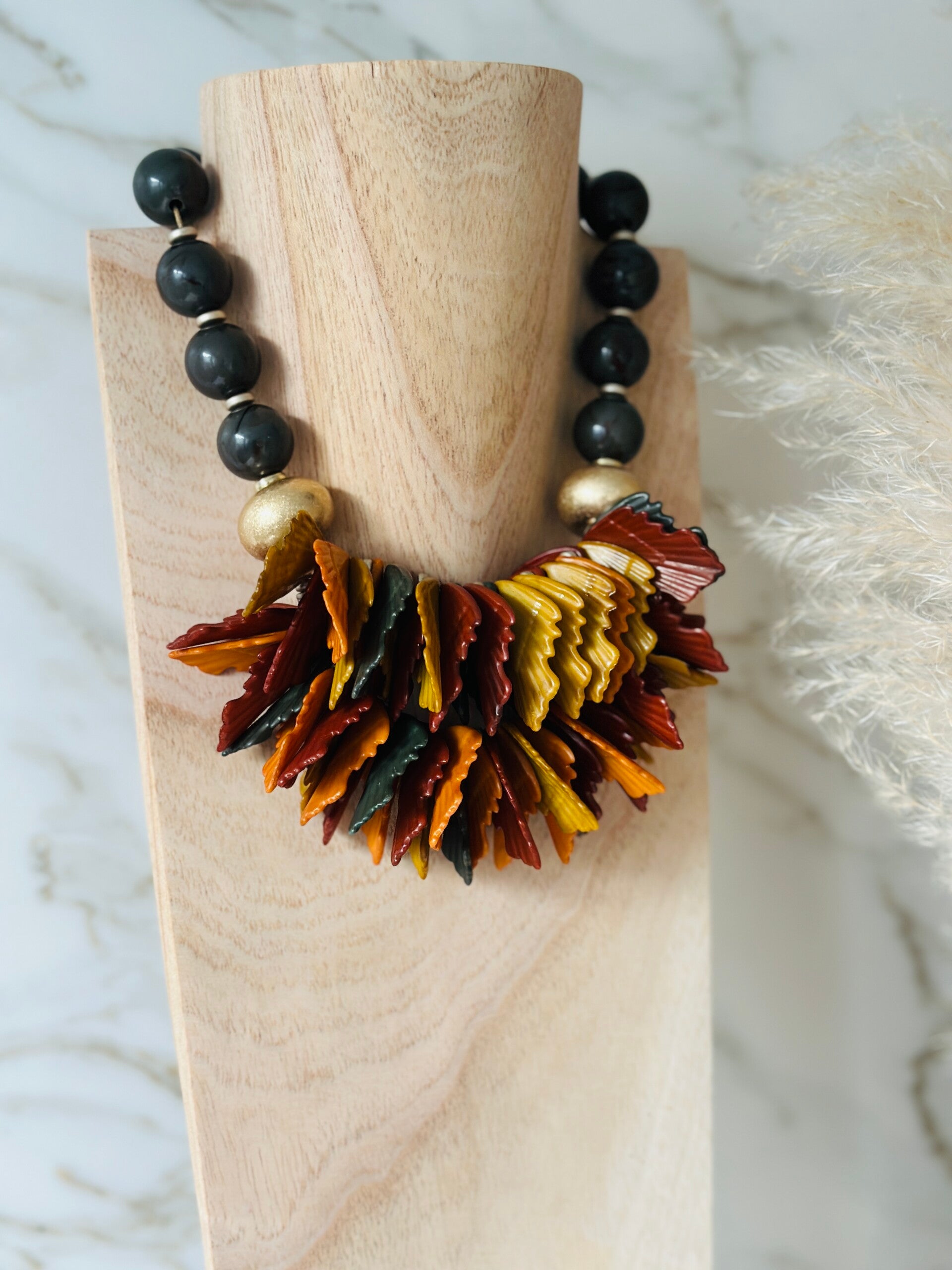 Necklace with large black beads and colorful, leaf-shaped pendants in autumn tones.